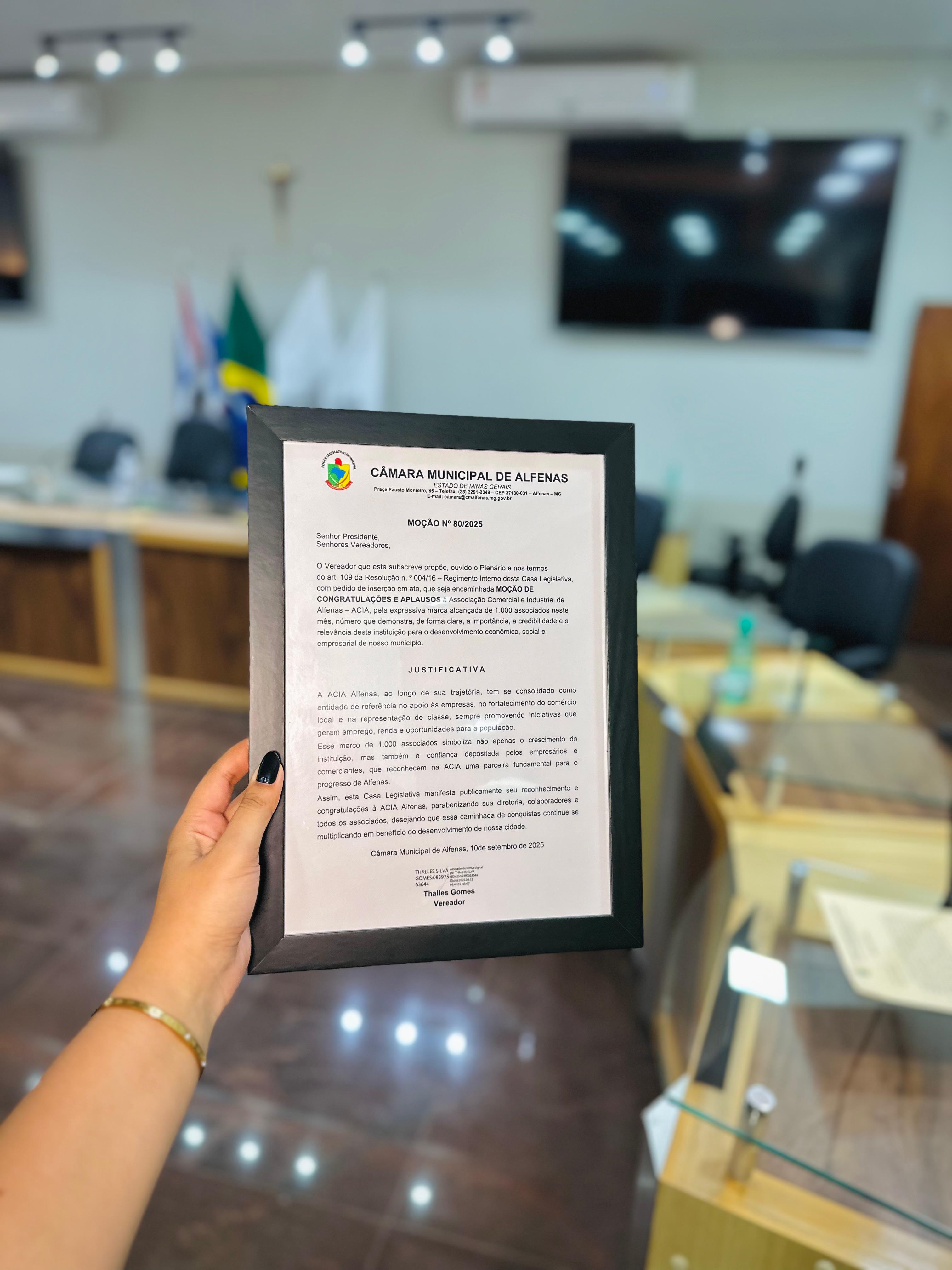 Segundo a justificativa da Moção, a ACIA Alfenas tem se consolidado ao longo de sua trajetória como uma instituição de referência no apoio às empresas, sempre promovendo iniciativas que incentivam o empreendedorismo, a inovação e a competitividade.