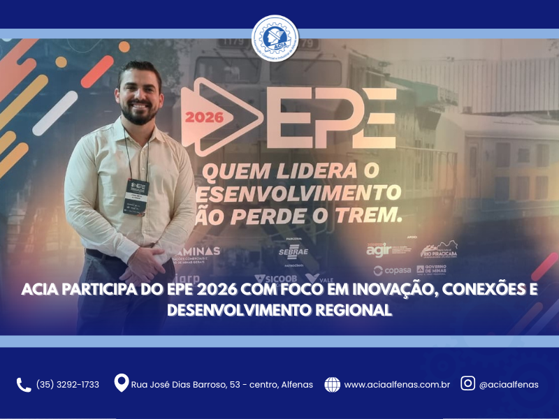A ACIA participa do EPE 2026 com o presidente João Petenuci e diretoria, em Belo Horizonte. O encontro reúne lideranças para debater inovação, desenvolvimento econômico e associativismo, promovendo networking e troca de experiências. A iniciativa fortalece estratégias que impulsionam o crescimento empresarial em Alfenas.