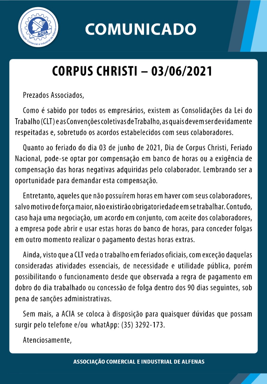 Comunicado : Feriado Corpus Christi