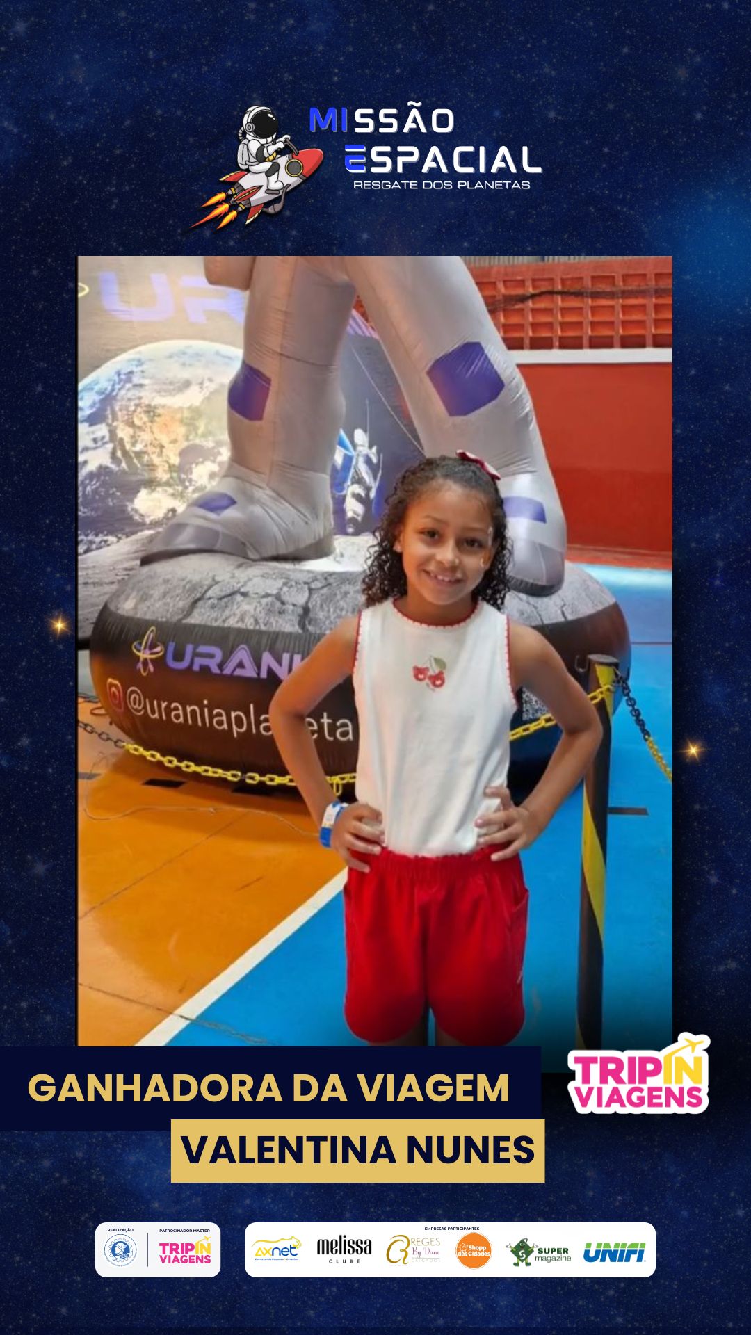A grande ganhadora da Missão Espacial foi Vanessa Caroline Nunes de Carvalho, responsável pela participante Valentina Nunes Teixeira, que completou todas as etapas da jornada estelar e conquistou o prêmio principal.